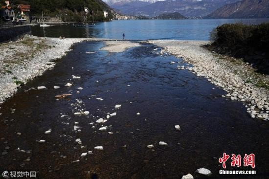 资料图:当地时间2019年3月19日,意大利科莫,受气候变化影响,意大利旅游胜地科莫湖的水量正在减少,目前的水量缺口达9500万立方米,比平均水平低21%。 图片来源:视觉中国