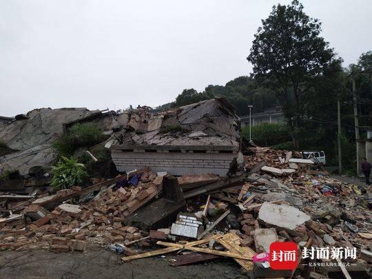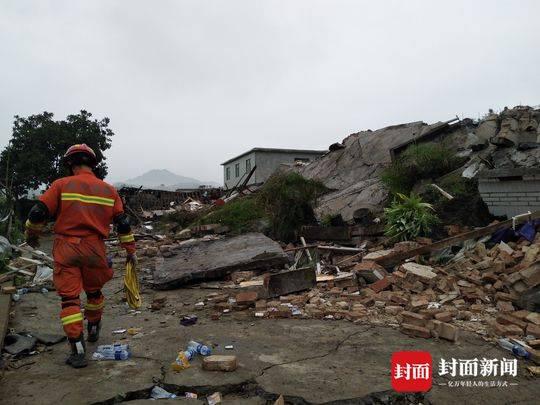 图为男孩的家。二层小楼已彻底变为一片废墟。