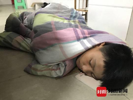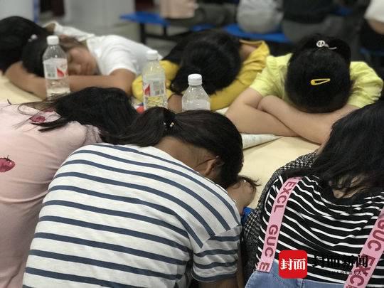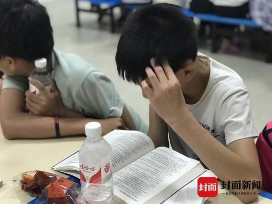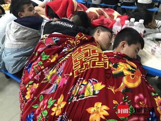 早晨5时40分左右,天渐渐亮了,在学校食堂内,342名学生坐在板凳上休息,还有的学生在喝着姜汤看着书。