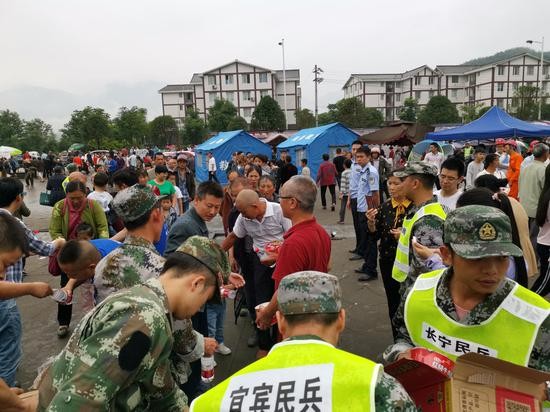 在四川宜宾长宁县双河镇广场,居民正排队领方便面和饮用水,民兵们正在搭建更多的帐篷。广场中央有一辆充电车,可以供数十人手机充电。一名经历过5·12地震的男子表示,虽然这次地震生活受到了影响,但这次通讯未断,手机可以保持畅通。