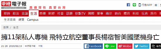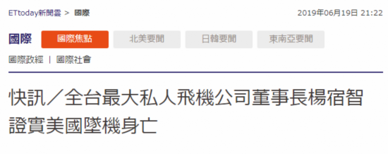 据多家台媒报道,台湾最大私人飞机公司“飞特立航空”19日传出噩耗:公司董事长杨宿智在美国坠机身亡。