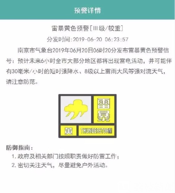 南京市气象台2019年06月20日06时20分发布雷暴黄色预警信号:预计未来6小时全市大部分地区将出现雷电活动,并可能伴有30毫米/小时的短时强降水、8级以上雷雨大风等强对流天气,请注意防范。