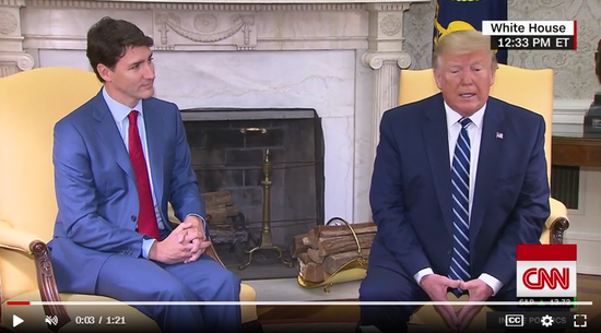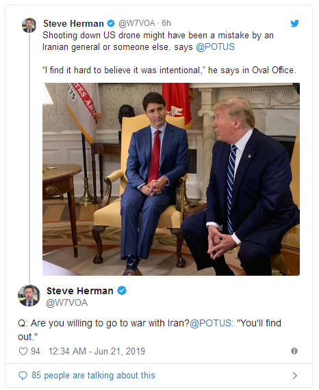 RT称,特朗普周四在会见加拿大总理特鲁多后谈到伊朗击落美军无人机一事。