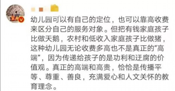 其中一段“雷人”的话语,大意如下:“我今天是来灭火的。政策要求我们办非营利性普惠,可我们做这家幼儿园有很多投资,如果能解决这个问题,我就同意办普惠。我在教育局说了,我们学的是养天鹅的技术,我们不会去养猪。当时把教育局的人气得鼻子都冒烟了。杜城村的村主任找我,要把村子里那些娃都送到这儿来,我不同意,这些孩子素质太低。”