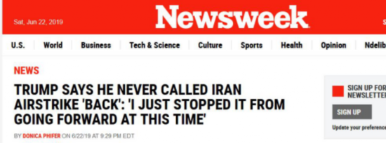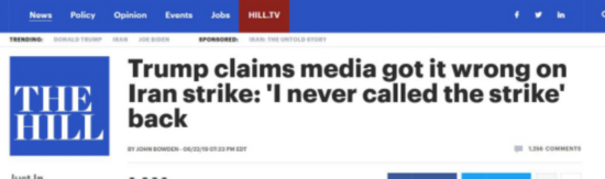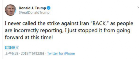 特朗普说,“我可从没说‘撤回’(BACK)对伊朗的打击,像人们都在错误地报道的那样,我只是在这一刻阻止了它向前推进。”