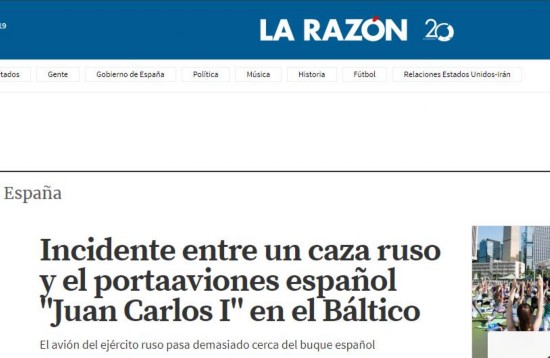 据西班牙《理性报》6月22日报道,当地时间21日,西班牙“胡安卡洛斯一世”号航母正在波罗的海参加北约联合演习。突然,一架俄罗斯苏-24战斗轰炸机以低速从航母附近飞过。