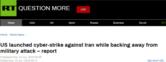 RT23日提到,网络攻击发生的一周前,美国总统国家安全事务助理博尔顿曾透露,美国正在加强对其对手的攻击性网络行动,对手名单中就包括伊朗。本周,美国媒体报道称,伊朗黑客正在对美国计算机系统造成威胁。白宫警告称,作为报复,他们可能会对伊朗进行网络攻击。