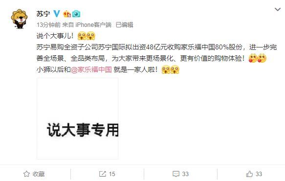 荔枝新闻讯(编辑/加戈) 6月23日,苏宁易购公告称,公司全资子公司苏宁国际拟出资48亿元收购家乐福中国80%股份。本次交易完成后,苏宁易购将成为家乐福中国控股股东,家乐福集团持股比例降至20%。