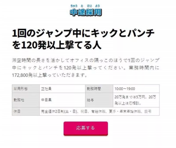 更奇葩的招聘要求还有:限时一次,只要能在跳跃起来的一瞬间挥出或是踢出120次拳脚,你就被录取了。(不可能吧~)