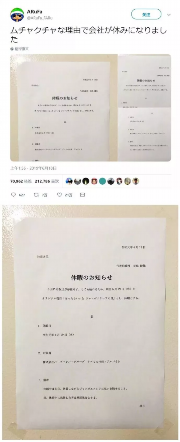 不要失望,小编在推特上还真发现有一家公司(株式会社バーグハンバーグバーグ),最喜欢找理由给员工放假!!