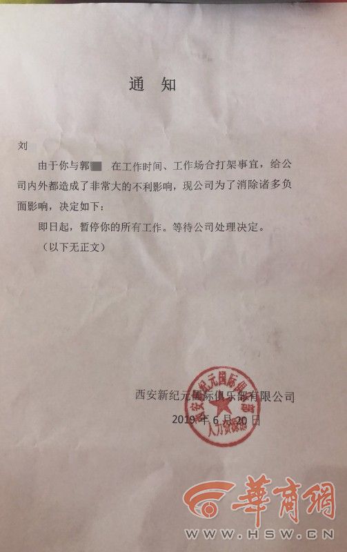 6月18日,刘女士接到自己和郭某被开除的通知,“公司人力告诉我,打架就要被开除,这是公司的规章制度,可是最开始动手的人不是我,我本以为能等到公司的说法,却没想到等到口头解聘通知。”