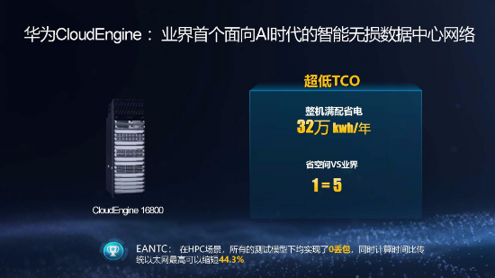 比如华为CloudEngine 16800,在整机配满的前提下每年可为客户节省电费高达32万KWH,总体来看,CloudEngine 16800还能够做到55%的机房空间节省,降低50%的耗电成本,降低49%的耗电成本,这对数据中心的TCO的下降的确很惊人。