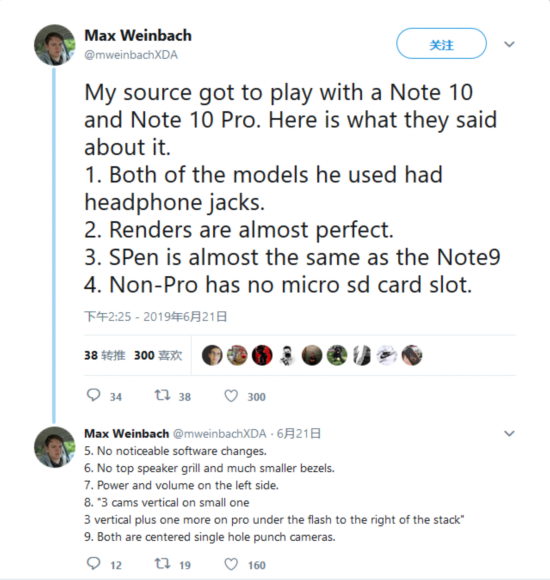 根据XDA的Max Weinbach最新推文爆料,非Pro版Galaxy Note 10将不会支持MicroSD卡扩展,意味着用户如果想要更大容量的存储空间,只能选择更大容量的规格版本或者选择Pro版本。此外他再次确认无论是否为Pro版本,Galaxy Note 10系列均取消3.5mm耳机端口。