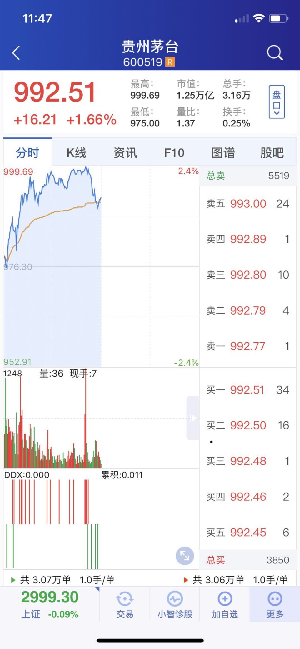 6月24日早盘盘中,贵州茅台股价再创新高,最高上探至999.69元,千元目标近在咫尺。截至午间收盘,该股报992.51元。