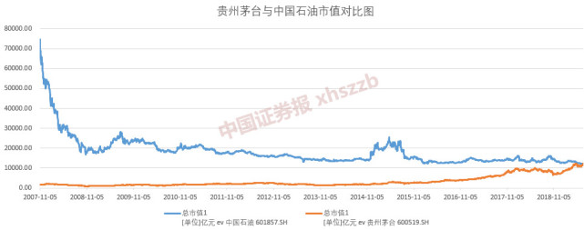 2007年11月5日,中国石油首发上市。当日,贵州茅台市值为1717.81亿元;而中国石油则是“万亿元”俱乐部成员,市值高达74828.16亿元。二者相差73110.35亿元。
