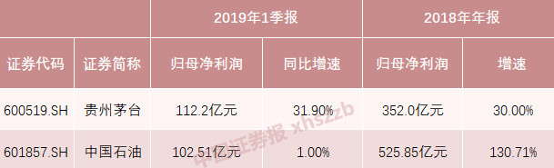 根据中国石油2019年一季报,按照中国企业会计准则,报告期内,归属于母公司净利润102.51亿元,同比增长1%。而同期贵州茅台归母净利润为112.2亿元,同增31.9%。