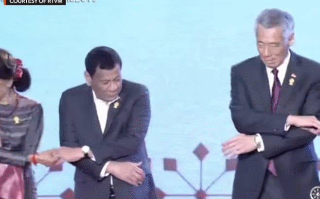 “Rappler”描述当时的场景称,第34届东盟峰会开幕式上,东盟10国领导人正伸出手来进行“东盟(传统)握手”时,站在杜特尔特身旁的李显龙与这位菲律宾领导人拉开了几步的距离。
