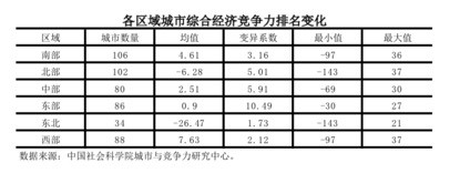 另一个特征则是中西部崛起、东北持续衰落。东部城市综合经济竞争力平均上升0.9名,中部城市综合经济竞争力平均上升2.5名,西部城市综合经济竞争力上升7.6名,而东北城市综合经济竞争力降低26.5名。