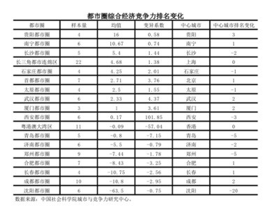 从都市圈角度来看,贵阳都市圈、南宁都市圈、长沙都市圈、长三角都市连绵区和石家庄都市圈综合经济竞争力平均上升幅度较大,而合肥都市圈、长春都市圈、成都都市圈和沈阳都市圈下降幅度较大。西安都市圈、粤港澳大湾区虽然总体排名变化幅度不大,但都市圈内小城市排名分化最为严重。此外,除了沈阳都市圈中心城市沈阳排名大幅下降20名以外,其它都市圈内中心城市,如贵阳、南宁、长沙、上海、南京、长春、成都的经济竞争力排名变化幅度均不大,都市圈大城市趋于收敛。