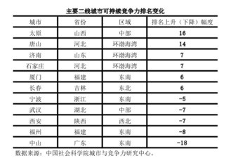 具体来看,中西部二、三线城市以及都市圈内中心城市的可持续竞争力普遍上升,如太原、唐山、石家庄、济南、长春、厦门、长沙、郑州、合肥等城市可持续竞争力呈上升态势。其中二线城市中太原、唐山上升幅度最大,其中太原上升16位,由2017年的第46名上升到2018年的第30名;三线城市中韶关、淮安、吉林、湘潭、江门等城市上升幅度最大,均在30位以上。此外,二线城市中宁波、武汉、西安、福州、中山的可持续竞争力呈下降态势,其中中山下降幅度最大,高达18位,由2017年的第45名跌到2018年的第63名;三线城市莆田、廊坊、马鞍山、邯郸、连云港的降幅最大,均下降了30位以上,其中连云港的可持续竞争力排名降低65位,由2017年的第90名下跌到2018年的155名。