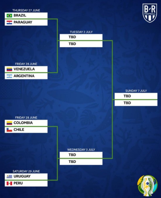 腾讯体育6月25日讯 美洲杯小组赛战罢,1/4决赛对阵出炉,巴西阿根廷遇到相对实力较弱的对手,有望半决赛会师,下半区则堪称群星闪耀的死亡半区,三支世界杯参赛队+智利大混战。
