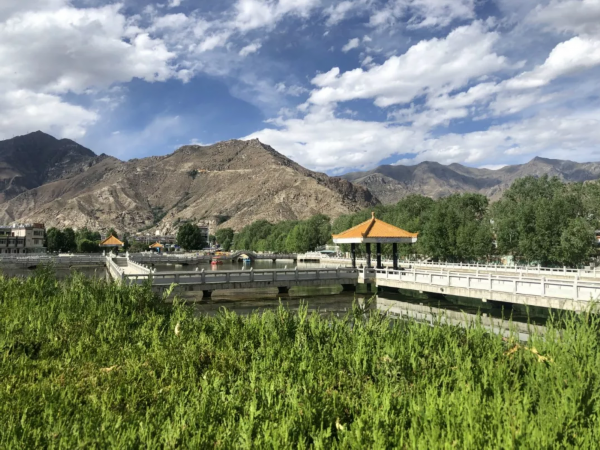 北郊还有一处公园也是许多人喜欢的地方,那就是慈松塘公园,廊桥、小亭,给这里添了几分江南味道,而清澈的池水,又让这里的空气湿润了不少。在一侧的草地上,偶尔可以看到避暑乘凉过林卡的人们。这里还有一处农家乐——糌娃农家乐,几座木屋、数顶帐篷、一些遮阳伞……来自四面八方的人聚在这里喝茶闲谈,微风吹过,舒适无比。除了铁观音、酥油茶、啤酒等茶水饮料,糌娃农家乐还提供点菜,中式、藏式菜品都有,价格走的都是平民路线,最便宜的素菜十几元就能吃到,最贵的菜也就刚过百元。包间按大小收费160至180元不等,消费满800元还可以免包间费。