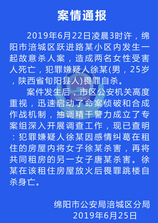6月25日,警方通报称,2019年6月22日凌晨3时许,绵阳市涪城区跃进路某小区内发生一起故意杀人案,造成两名女性受害人死亡,犯罪嫌疑人徐某(男,25岁,陕西省旬阳县人)畏罪自杀。