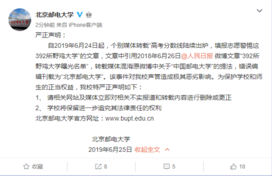 自2019年6月24日起,个别媒体转载“高考分数线陆续出炉,填报志愿警惕这392所野鸡大学”的文章,文章中引用2018年6月26日@人民日报 微博文章“392所野鸡大学曝光名单”,转载媒体混淆原微博中关于“中国邮电大学”的提法,错误编辑刊载为“北京邮电大学”。该事件对我校声誉造成极其恶劣影响。为保护学校和师生的正当权益,我校特严正声明如下: