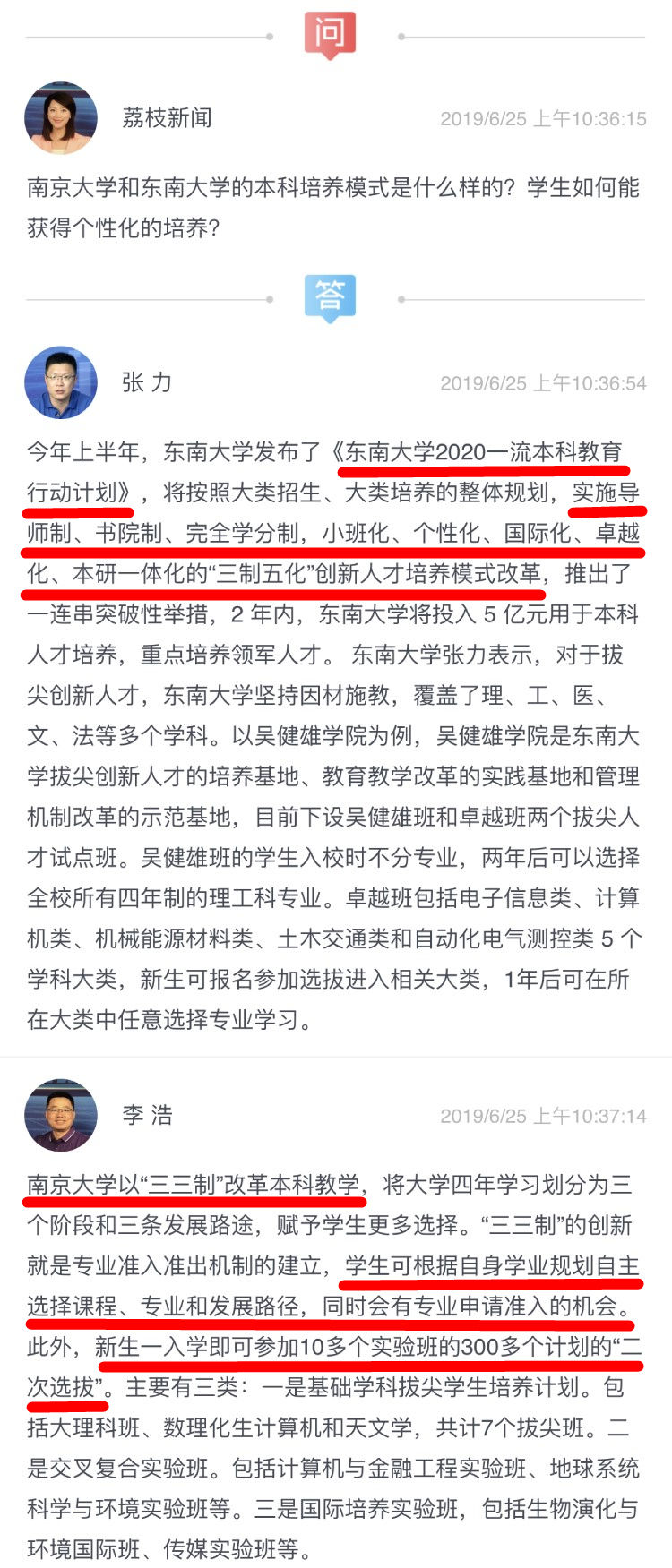 东南大学教务处副处长、招办主任张力(左) 南京大学本科招生办公室主任李浩(中) 荔枝新闻主持人严贝茜(右)