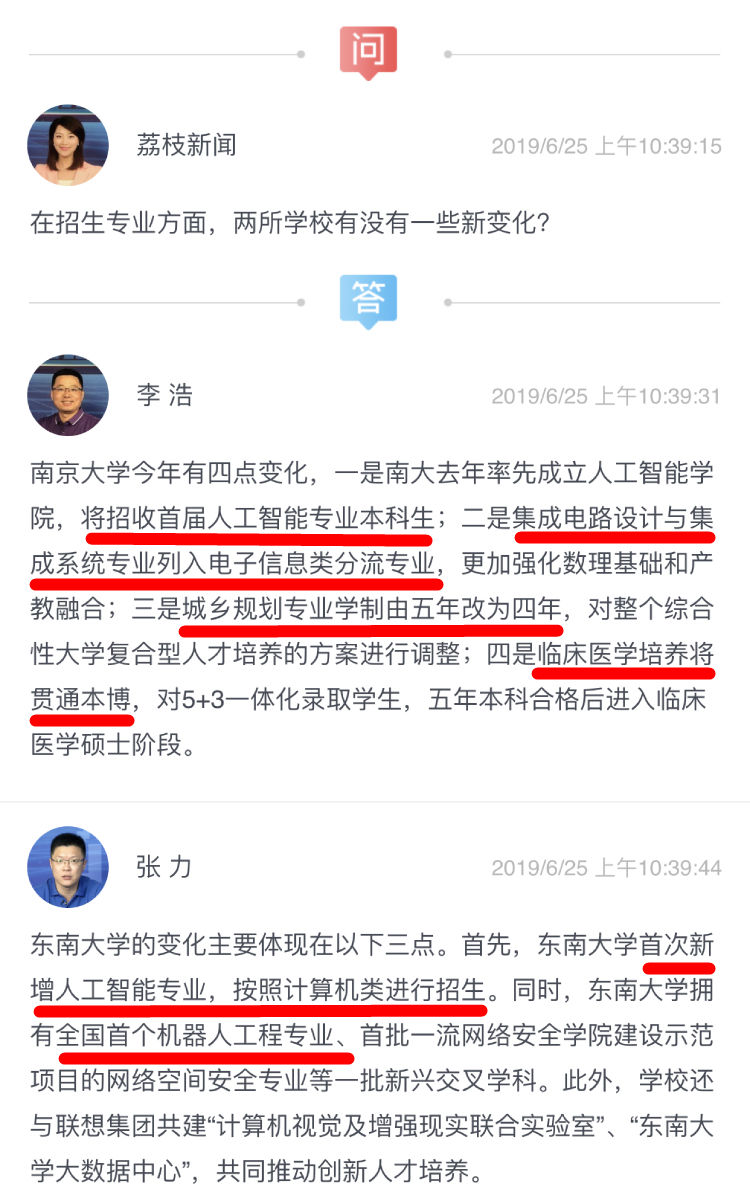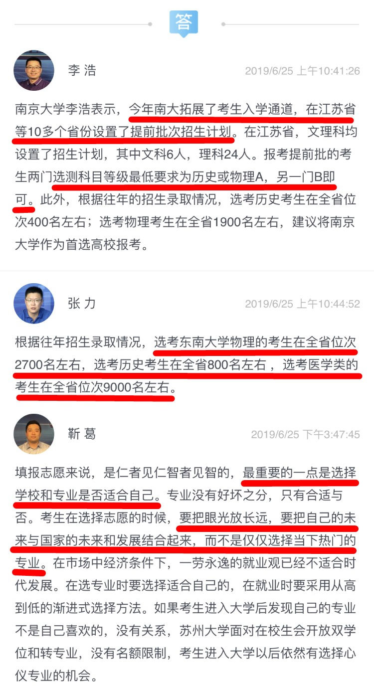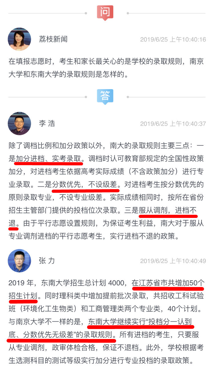 在今天的两场直播中,南京大学本科招生办公室主任李浩,东南大学教务处副处长、招办主任张力,南京师范大学学生工作处副处长王昕和苏州大学招生就业处副处长靳葛作客直播间,在线指导考生填报志愿。