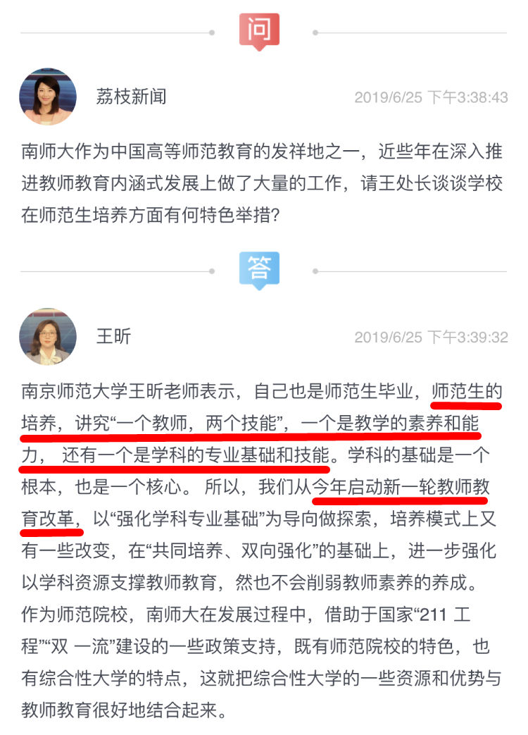 作为中国高等师范教育的发祥地之一,南京师范大学在深入推进教师教育内涵式发展方面做了大量工作。在直播中,当主持人问到南师大在师范生培养方面有哪些特色举措时,南京师范大学学生工作处副处长王昕表示:“师范生培养,讲究‘一个教师,两个技能’,两个技能是指教学的素养和能力以及学科的专业基础和技能。”从今年开始,南京师范大学针对师范生培养将启动新一轮教师教育改革。