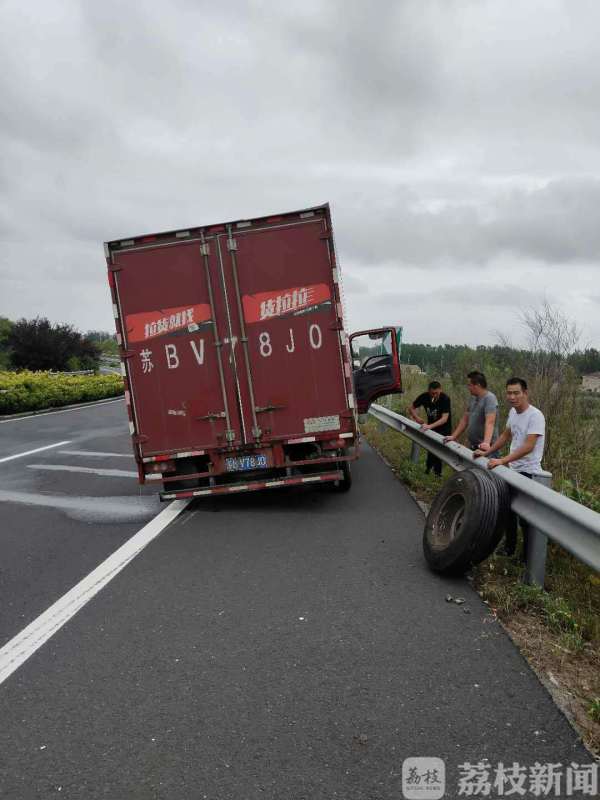 上午8点55分左右,高速三大队民警朱飙、辅警郑田亮巡逻至特庸枢纽段时发现一辆车号为苏BV78J0的轻型厢式货车停靠于应急车道,车辆呈半斜状,在距离该车不远处发现脱落的轮胎。
