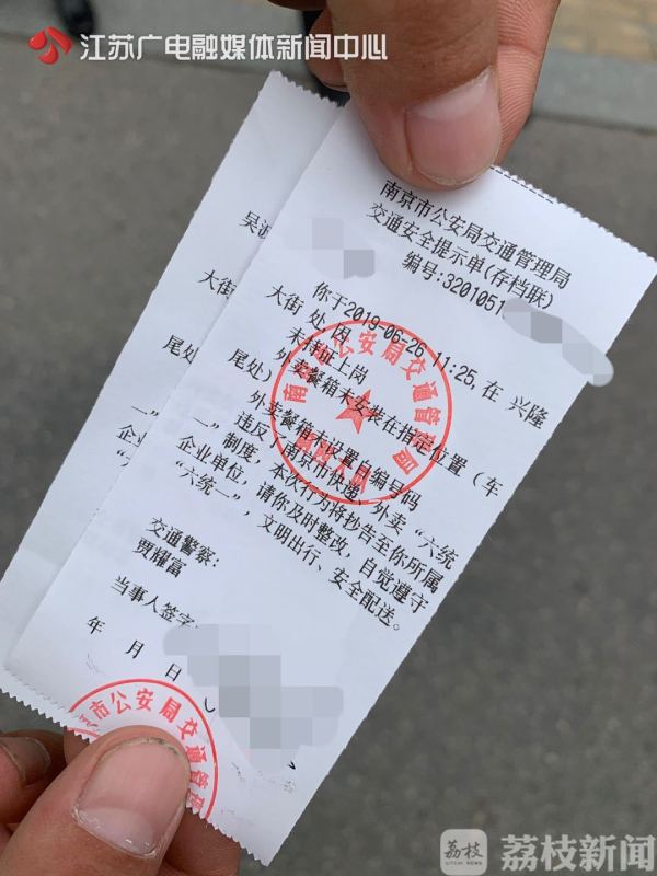 南京交警四大队民警贾耀富现场告诉记者:主要问题是骑手没有佩戴制式头盔,没有穿戴制式统一工作服饰,外卖箱没有放在车尾指定位置进行固定,没有行业编码,电动车车牌污损严重,还有没有持证上岗。从头盔到服饰,从证件到号牌,可以说‘六统一’是面面没有俱到,六不统一。”除了口头劝导,交警现场开具了交通安全提示单。对于这项新规,骑手们都表示认可。