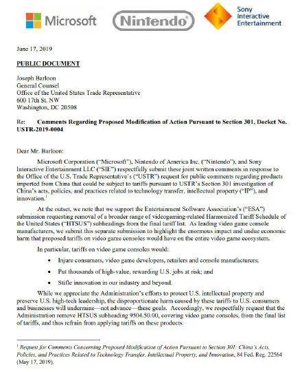 日前,据外媒曝光,索尼(Sony)、微软(Microsoft)和任天堂(Nintendo)本月17日联合致函特朗普政府,共同反对美国政府在贸易战中对中国商品征收关税,称这将严重损害整个视频游戏行业及其雇员的利益。这三家公司在联名信中表示,上调25%的关税将导致美国消费者多支付8.4亿美元来购买游戏机。
