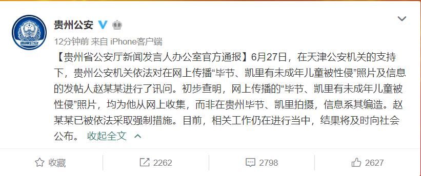 荔枝新闻讯 6月27日,贵州省公安厅新闻发言人办公室就“幼儿遭性侵”一事发布官方通报,通报称在天津公安机关的支持下,贵州公安机关依法对在网上传播“毕节、凯里有未成年儿童被性侵”照片及信息的发帖人赵某某进行了讯问。初步查明,网上传播的“毕节、凯里有未成年儿童被性侵”照片,均为他从网上收集,而非在贵州毕节、凯里拍摄,信息系其编造。赵某某已被依法采取强制措施。目前,相关工作仍在进行当中,结果将及时向社会公布。