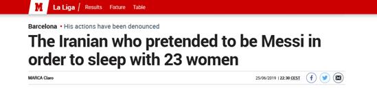 西班牙《马卡报》25日报道说,一个长得很像梅西(Lionel Messi)的伊朗男人希望借此诱奸女性。