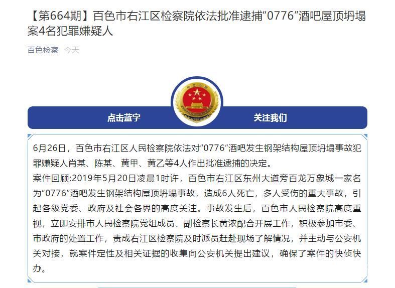荔枝新闻讯 据百色检察微信公号消息, 6月26日,百色市右江区人民检察院依法对“0776”酒吧发生钢架结构屋顶坍塌事故犯罪嫌疑人肖某、陈某、黄甲、黄乙等4人作出批准逮捕的决定。