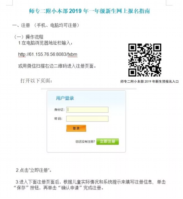 1.先网上预报名:适龄儿童家长登陆http://61.155.76.56:8082/fxlh网页注册填写,并下载打印。