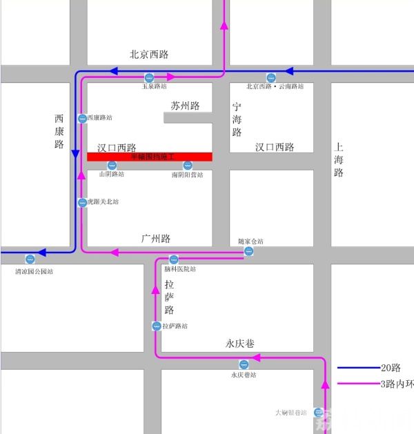 具体:20路由北京西路-上海路-汉口西路-西康路-广州路,调整为北京西路-西康路-广州路;3路内环由广州路-宁海路-汉口西路-西康路-北京西路,调整为广州路-西康路-北京西路。