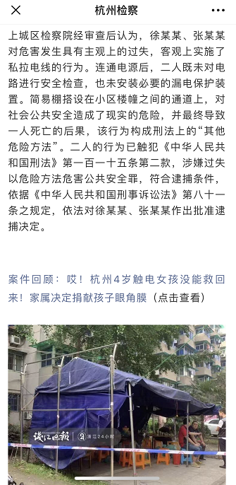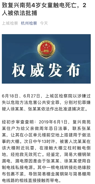 6月2日下午,杭州复兴南苑小区一名4岁女孩在楼下玩耍时碰到做法事的大棚钢管,触电倒地,4日经抢救无效身亡。据测验,这根带电的大棚钢管电压为209伏。