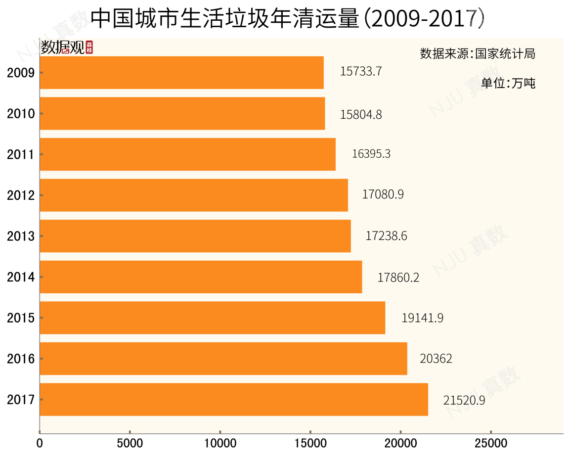 城市生活垃圾量节节攀升,2017年全国清运量可绕地球10.8圈