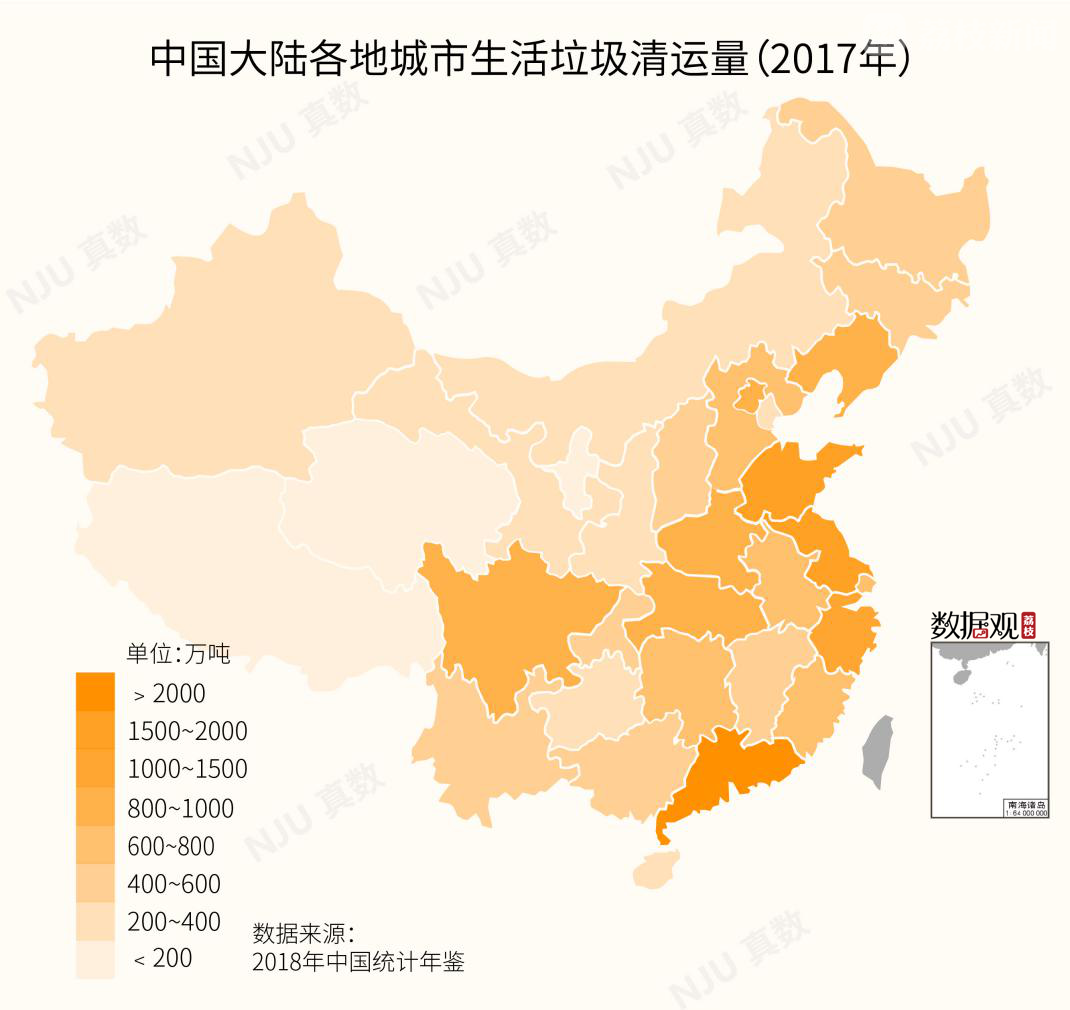 从地图上看,人口密集、经济发达的地方,垃圾产量相应较多。2017年,全国各地生活垃圾清运量,广东排第一,达到2644万吨,江苏紧随其后,为1734万吨。