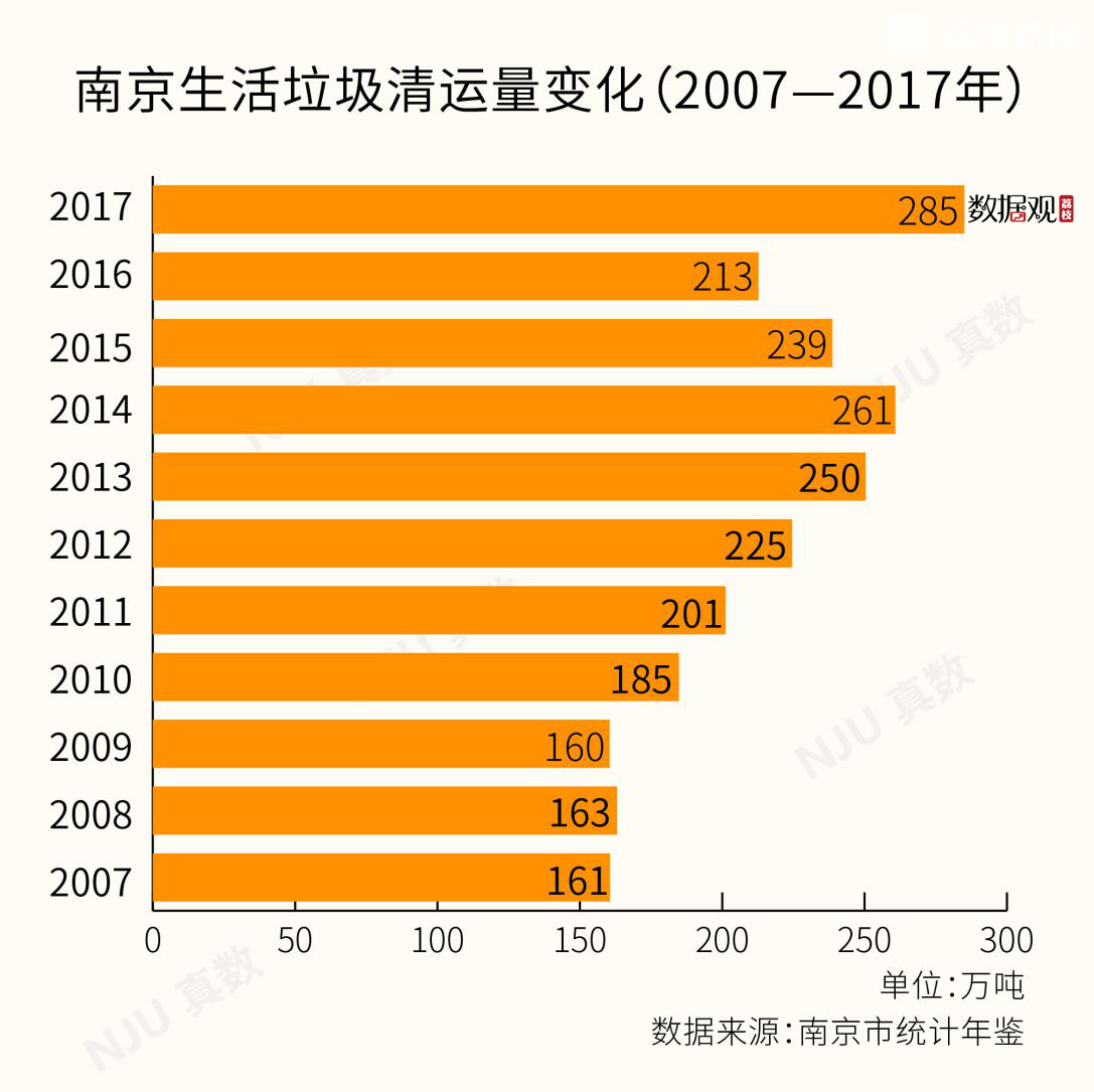 据荔枝新闻了解,南京作为江苏省会城市,目前每天产生的生活垃圾近8000吨,一年可达290万吨。从2007年到2017年,南京生活垃圾年清运量从161万吨上升到285万吨,增加了77%,平均每年垃圾清运量以7%的速度增加。