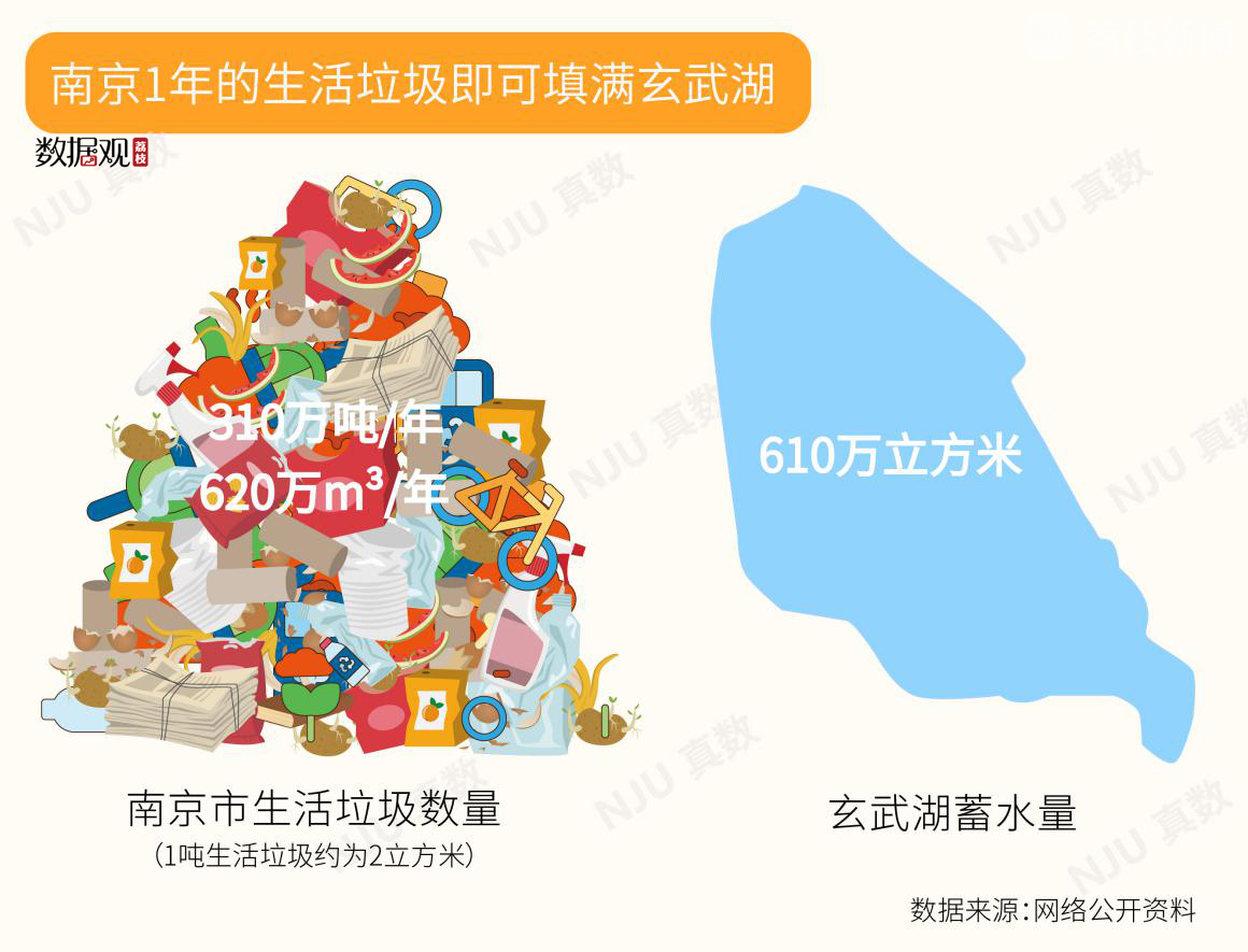 照这样的速度,明年(2020年)南京一年的生活垃圾将达310万吨,即620万立方米。按照目前玄武湖610万立方米的蓄水量来换算,南京一年产生的生活垃圾即可填满整个玄武湖。