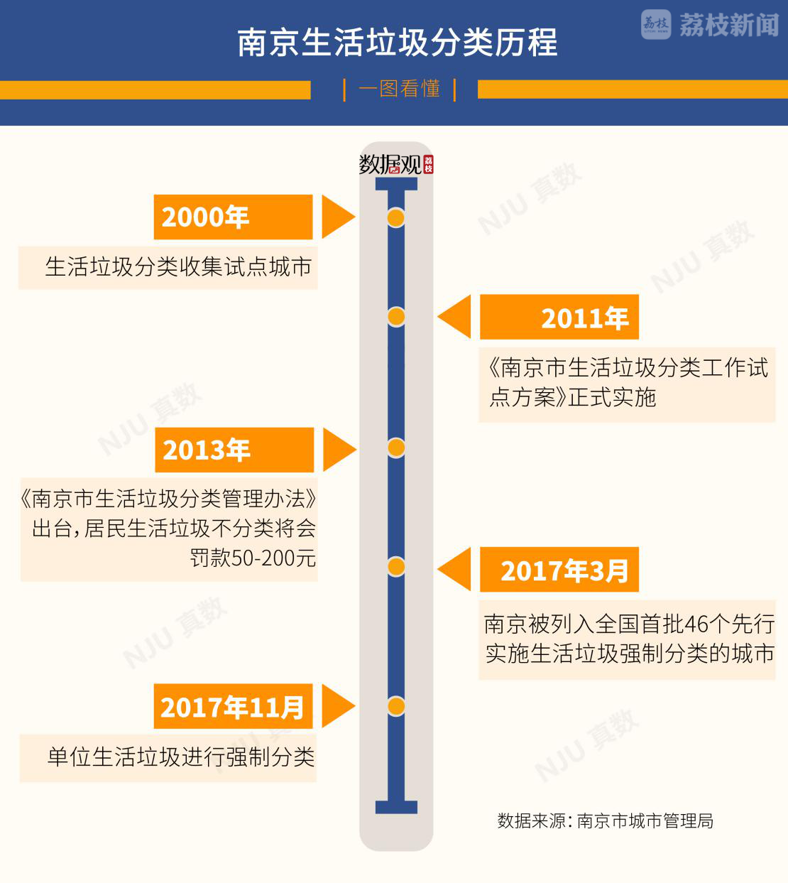 2000年,住房和城乡建设部发布《关于公布生活垃圾分类收集试点城市的通知》,南京与北京、上海、广州、深圳、杭州、厦门、桂林一起,成为首批生活垃圾分类收集试点的八个城市。近二十年来,南京生活垃圾分类政策不断细化。