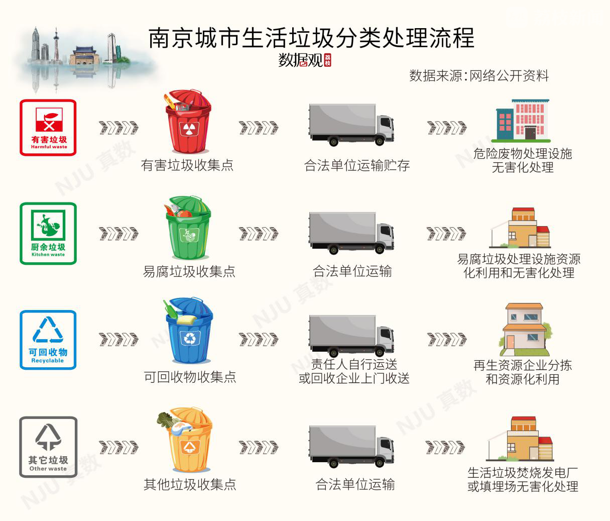 2017年,南京提出按照“大分流+小分类”的原则对垃圾进行分类收集、分类运输和分类处理。“大分流”方面,推进各区(园区)分级分区域设置垃圾分类贮存分拣中心,增强和完善农贸市场垃圾、餐厨废弃物、道路机扫垃圾、电子垃圾、大件垃圾等的专项分流收运处置体系建设。“小分类”方面,主要通过可回收物、厨余垃圾的回收再利用和生化处理,减少进入末端处理设施的生活垃圾量。