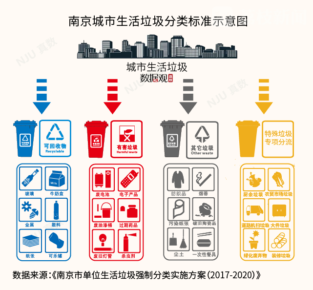 垃圾分类首先要制定相应的分类标准。南京将生活垃圾分为日常生活垃圾和特殊垃圾两大类,日常生活垃圾包括有害垃圾、可回收垃圾和其他垃圾三个子类,特殊垃圾则包括餐厨垃圾、装修垃圾、大件垃圾、园林绿化废弃物、农贸市场垃圾、道路机扫垃圾等。