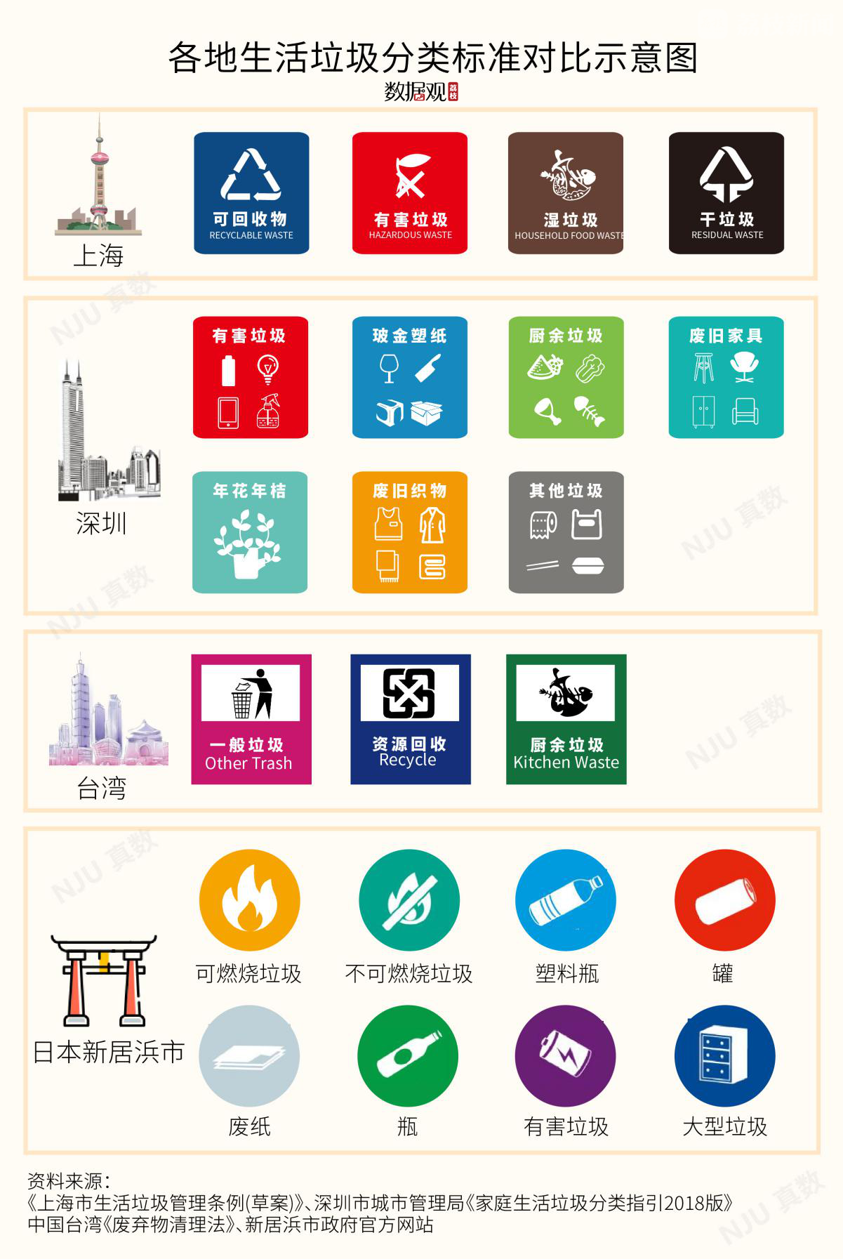 对比中国其他城市和国外城市,荔枝新闻发现分类标准各有不同,如上海将生活垃圾分为可回收物、有害垃圾、湿垃圾、干垃圾等四类;中国台湾则将生活垃圾分为一般垃圾,资源回收垃圾和厨余垃圾。深圳则为广东人家中的年味担当“年花年桔”增设了专门的分类,极具地方特色。日本新居浜市分类则更为细致,一共分为8种。