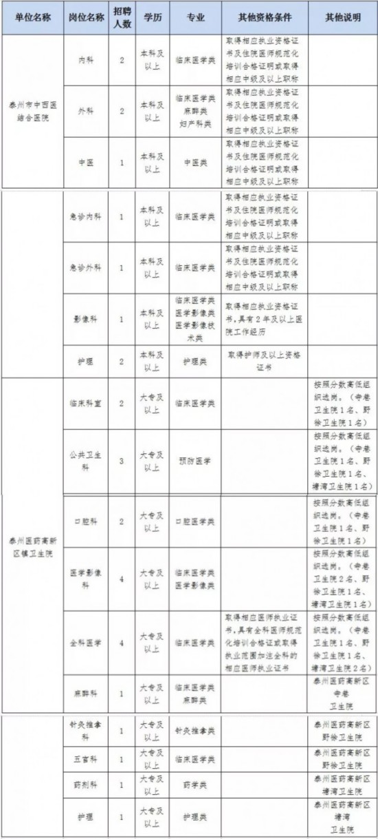 ①2019年泰州医药高新区医疗卫生事业单位公开招聘工作人员岗位表