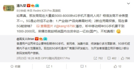 对于明年5G手机要干到1000-2000元的说法,小米产业投资部合伙人潘九堂也表示:“如果真,那友商现在大量卖5000-8000块4G手机不是坑人吗?相信友商不会表里不一。5G是必然但不必急:1、产业链/产品完善需时间;2、新应用需探索,现在拿5G能做啥?”